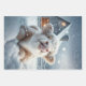 This 19x29 wrapping paper features a fluffy Highland calf lying in the snow with its tongue out, framed by a cozy barn glowing with warm light. Snowflakes dust its fur as gentle snowfall blankets the rustic fence and roofline, creating a serene winter farm scene. Designed for flat-surface decoupage, this paper is perfect for holiday crafting, journal covers, mixed media, or farmhouse décor. The soft palette and charming expression make it ideal for seasonal storytelling and rustic Christmas collections.