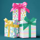 A set of three Easter wrapping paper sheets with matching patterns in bright colors for your Easter celebration. White Easter bunnies hugging their delicious and colorful Easter eggs. lots of yellow baby chicks hatching from colorful eggs and surrounded by more Easter eggs. And a matching striped paper.