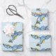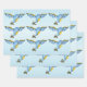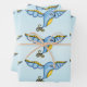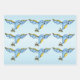 Este conjunto de hojas de papel envolvente son de color azul claro con una imagen repetida de un pájaro volador de fantasía con cara de bonito y acentos amarillos. Tiene una cola amarilla enrollada.