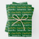 Este papel de envoltura verde forestal tiene un guión de oro falso (no de Relieve metalizado) que dice Feliz Cumpleaños. También tiene texto en blanco para el nombre del destinatario. (Mostrado: Samantha) El texto está en un patrón.