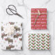 Bonitas y modernas sábanas de papel envolvente con tres patrones diferentes, la primera con un lindo reno personalizado con copos de nieve rojos y verdes sobre un fondo blanco; la segunda hoja es roja, con el texto Felices Fiestas en blanco y verde todas las tapas con letras; la tercera en blanco con un patrón de hojas verdes y rojas.