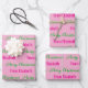 Las sábanas son de color rosa claro. Todos ellos tienen un patrón de texto para un mensaje personalizado como Feliz Navidad y el nombre del donante. Feliz Navidad aparece en un elegante guión verde. El otro texto es rosado. Todo el texto se puede editar.