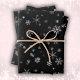 Hojas de papel de envolvimiento de vacaciones en el patrón de copo de nieve en blanco y negro. Copos de nieve por todas partes. Hermosos copos de nieve blancos de diferentes tamaños y formas sobre fondo negro.