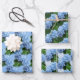 Hojas de papel de envoltura floral azul. Cada hoja tiene un patrón de flores de hidrangea azul claro y realista, con hojas verdes. Los colores del fondo son azul claro, verde oscuro y azul pálido.