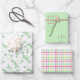 Este surtido primaveral de papel envuelto incluye verde sobre helechos blancos, un colorido resorte recubierto de blanco y flores triplicadas sobre un fondo verde pastel.
