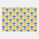 Esta envoltura de regalo audaz presenta círculos geométricos brillantes azules y amarillos y formas de semicírculo sobre un fondo blanco.