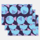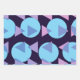 Tres hojas de papel envolvente en un estético morado y azul con un patrón abstracto de formas geométricas.