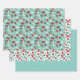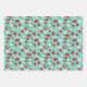 Hojas de papel de regalo temáticas de fresa rojas y azules con tres patrones de fresa coincidentes: una hoja con fresas rojas, hojas y flores blancas sobre un fondo azul, una hoja con muchas fresas en rojo y tonos de azul y turquesa, y una hoja turquesa con pequeñas semillas de fresa también en azul y turquesa. Hojas de papel de regalo perfectas para cumpleaños temáticos de fresa, baby showers de niño temáticos de fresa y baby showers de novia temáticas de fresa.