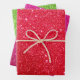 Red, pink, and green glitter gift wrapping paper sheets for festive holiday presents.
