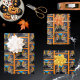 Un hada con alas naranja y amarillas sentada sobre escalones de piedra que conducen quizás al reino de los hados. La hada afroamericana no está sola, está con su perro guardián doberman este día de otoño.