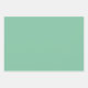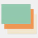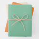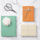 A trio of solid color wrapping paper sheets in holiday retro colors. Featuring one each of a solid color retro tan, orange, and sea foam green gift wrap sheet.