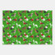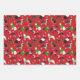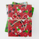 Perros de Navidades muy amables vestidos con ropa festiva. Los pastores alemanes con abrigos blancos, negros, negros y tostados, negros y rojos, negros y plateados llevan sombreros de Papá Noel, corderos, sudaderas sobre un fondo rojo, verde y azul claro con ornamentos dispersos envueltos en hojas de papel.