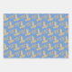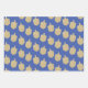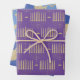 Papel de envoltura moderno de Hanukkah con coloridos tonos de papel violeta azulado con menorahas de oro moderno en uno, sueños de oro bailando en otro y palomas voladoras de oro llevando una rama de olivo; esa misma paloma que regresó al arco de Noé llevando la rama de olivo simbólica de tierra seca, paz con dios, inocencia y pureza.