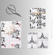 Conjunto moderno y divertido de patrones de papel para los amantes de París en blanco y negro. Un patrón de la Torre Eiffel, una tipografía de París y una mujer de la moda de París