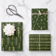 Tres sábanas festivas con tres diseños. Árboles tribales de Boho, chevrones y estrellas. Patrones impresos en falso Relieve metalizado de oro. Hojas de papel de ajuste de patrón bohemias de oro verde de Navidad. Color #1B3007