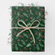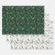 Este juego de hojas para envolver de regalo de los Navidades presenta un patrón acuarela de hojas verdes y bayas rojas. Dos hojas del papel tienen la imagen impresa en un fondo blanco, mientras que la tercera tiene la misma imagen en un fondo verde oscuro. Juntos, hacen una bonita presentación de un paquete de regalo que contrasta.