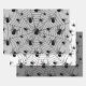 Hojas de papel de envolvimiento de Halloween con telaraña blanca y negra. Suministros y artesanías fiestas con elegante patrón de diversión. Espeluznante diseño de telaraña de Halloween sobre blanco y gris personalizado con arañas grandes y pequeñas espeluznantes.
