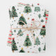 Aquí hay un divertido y brillante conjunto de tres diseños de Navidades envueltos en hojas de papel con dos diseños que usan los árboles como diseño predominante. Los colores utilizados son predominantemente verde y blanco, con toques de oro y rojo. Junto con las imágenes de los árboles, un papel contrasta bien al usar rayas rojas, verdes y blancas.
