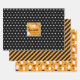 Envuelve tus regalos y artículos de Halloween en estas divertidas sábanas de papel de envoltura con patrones de spooktaculares. Uno es negro con un patrón de pequeñas estrellas blancas y una etiqueta a la que puedes agregar tu nombre rodeado de un fantasma, un murciélago y arañas. Uno de ellos presenta rayas en negro, blanco y naranja. Y uno muestra un divertido patrón de fantasmas, murciélagos y huesos en negro, naranja y blanco.