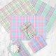 Conjunto de tres hojas de papel de envoltura. Cada sábana presenta un patrón diferente en tonos pastel: rosa, violeta, verde, azul, verde y amarillo.