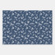 Navidades azules, verdes y blancos envolviendo hojas de papel con patrones de colores coincidentes: una con ramas de mistletoe verde. Una con rayas azules, verdes y blancas. Y una en azul marino con ramas de mistletoe blancas.
