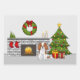 El original ilustracion personalizado de Destei de un lindo color blenheim Cavalier Rey Carlos español perro de raza. El perro está situado en una sala de fiestas con chimenea. Dos medias rojas cuelgan del mantel de la chimenea. En la parte superior de la chimenea hay una corona verde decorada con un arco rojo y círculos amarillos como luces. En la parte superior del mantel hay tres pequeños árboles en forma de triángulo, decorados también con círculos amarillos. Al otro lado del mantel hay dos velas de color beige. Al lado de la chimenea hay un árbol de Navidad verde y festivo con dos regalos debajo. El árbol de Navidad está decorado con adornos rojos y amarillos y una guirnalda gris. Sobre el árbol hay una estrella amarilla.