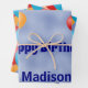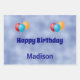 Puede personalizar su mensaje en la hoja superior con texto azul marino. Se muestra texto para mostrar: Feliz cumpleaños Madison. Las otras hojas tienen un patrón de globo colorido.