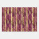 Pinceles de pincel y hojas de papel de envoltura de confeti. La primera hoja muestra pinceladas en burdeos y oro y confeti, la segunda en azul verde azulado y la tercera en naranja.