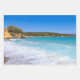 Envuelto en hojas de papel con una fotografía que muestra una playa en la isla griega de Creta. Una bonita playa azul tropical con olas de surf. Maravilloso y tranquilo destino de viaje.