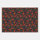Bonito que envuelve hojas de papel con tres patrones coincidentes: una hoja con amapolas rojas en un fondo negro, una hoja negra con amapolas blancas y una hoja roja con puntos de polka blanco.