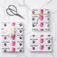 Este conjunto de sábanas de papel de envoltura son blancas con puntos rosados de polka y filas de gatos negros y blancos de Atomic 1950 sentados en una silla rosa con el texto Feliz cumpleaños con una huella de pata de gato negro.