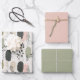 Estas sábanas de papel de envolvimiento presentan un patrón botánico caprichoso de estribos de follaje y pinceladas de broche en verde salvia, beige, rosa rubor, gris de carbón y verde oliva en un fondo beige claro. Las dos hojas restantes se coordinan en tonos sólidos de verde salado y rosa rubor.