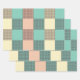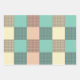 A seamless plaid pattern with alternating pastel squares in turquoise, cream, and beige. Each square is filled with a crisscross grid design, creating a vintage and orderly feel.