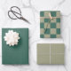 Una hoja de ajuste tiene un patrón de tablero de ajedrez. La hoja de envolvimiento verde del bosque es de color sólido. La hoja de envolvimiento de salvia es también de color sólido.