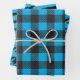 3 hojas de papel de envoltura con estampado azul. Una hoja de papel de envolvimiento de búfalo azul, una hoja de papel de envoltura de cascos azules y una hoja de papel de envoltura azul a rayas.