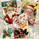 The three designs, featuring classic Santa Claus illustrations, offer a nice variety while maintaining a unified, old-fashioned aesthetic. The set has a cohesive Victorian/Edwardian era Christmas feel due to the style of the illustrations, the presence of angels, holly, and the focus on the traditional, pre-modern interpretation of Santa Claus. The rich reds, deep greens, and creamy yellows create a warm, nostalgic palette.