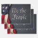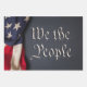Words of the US Constitution "We the People" written on a chalkboard with a vintage American flag border