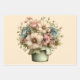 Wrapping paper sheets with a cute image. Blue. pink and cream colored flowers with green leaves. Set inside a green flower pot with a green plaid cloth hanging over the side.