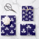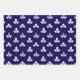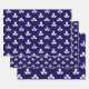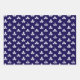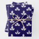 A navy blue and white wrapping paper sheet trio featuring a white stamped clover motif on a navy blue background.