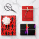 Hojas de papel de envoltura zombi. Colores rojos y negros con imágenes de los muertos caminando en silueta está en una hoja. Uno es un patrón de estallido rojo, y el tercero es negro sólido con un patrón zombi en colores brillantes. Perfecto para envolver regalos para un cumpleaños o evento con temática de horror.