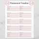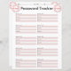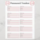 Rastreador de contraseñas con espacio para el nombre de sitio web o aplicación, nombre de usuario y contraseña.
