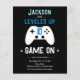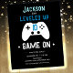 Simple invitación de cumpleaños para jugadores de controlador de juegos minimalista. ¡Has alcanzado el nivel de edad! Todo el texto es personalizado. Líneas de neón simples divertidas en la parte posterior de la tarjeta.