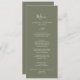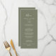 Esta carta de menú de la cena y de las bebidas, de color verde oscuro y hoja mínima, es perfecta para un boda boho. El diseño presenta una sencilla silueta de hojas de vegetación en verde oliva con un estilo bohemio minimalista de montaña. Este menú incluye el menú de la cena por un lado y el de las bebidas por el otro. Se puede utilizar para la recepción de bodas, la cena de ensayo o cualquier evento.