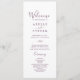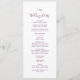 Este programa mínimo de bodas de berenjenas en hojas es perfecto para un boda boho. El diseño presenta una sencilla silueta de hojas de vegetación en un romántico color violeta oscuro con un minimalista estilo bohemio-jardín. Incluya el nombre de la pareja, la fecha y ubicación del boda, mensaje de agradecimiento, orden de servicio, fiesta de boda y un monumento opcional "en memoria amorosa".