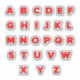 Hoja pegatina de alfabeto estándar, letras A-Z. Color rojo, aspecto grabado en relieve.