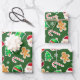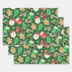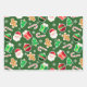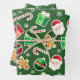 Fondo verde oscuro con fotos de Santa, latas de dulces, galletas de jengibre, copos de nieve, árboles de Navidad y regalos que parecen pegatinas. Papel divertido para niños o adultos.