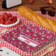 Hojas de arce rojas y blancas sobre un fondo de carbón. (Fondo rosa también disponible).