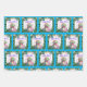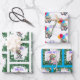 Papel de envoltura colorido para cualquier niño que ame los dinosaurios! Cada uno sostiene a nuestro bebé dinosaurio en una pose diferente - una con una torta de cumpleaños, una con globos y otra con un gorra de cumpleaños.
