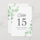 Hojas de eucalipto en acuarela. Follaje botánico verde. Números de mesa para celebración de boda. El diseño se repite en el reverso.
