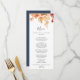 Este otoño deja una carta de bodas blancos y borgoñones perfecta para un boda de octubre. El diseño rústico presenta unas impresionantes hojas de otoño de acuarela pintadas a mano en las sombras de puesta de sol de amarillo, naranja quemado y rojo burdeos. Este menú se puede utilizar para la recepción de bodas, la cena de ensayo o cualquier evento.